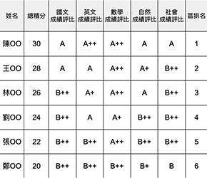 全體成績單大表,內容包含所有匿名個人成績資訊,提供參閱各區成績資訊。