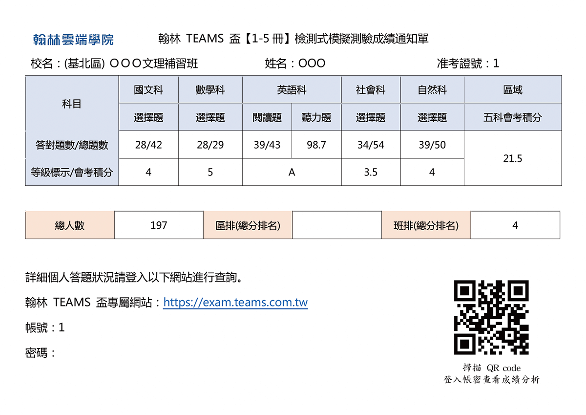仿真模擬考成績單樣式,提供完整個人成績資訊,包含各科答題資訊、五科目成績資訊以及排名資訊。