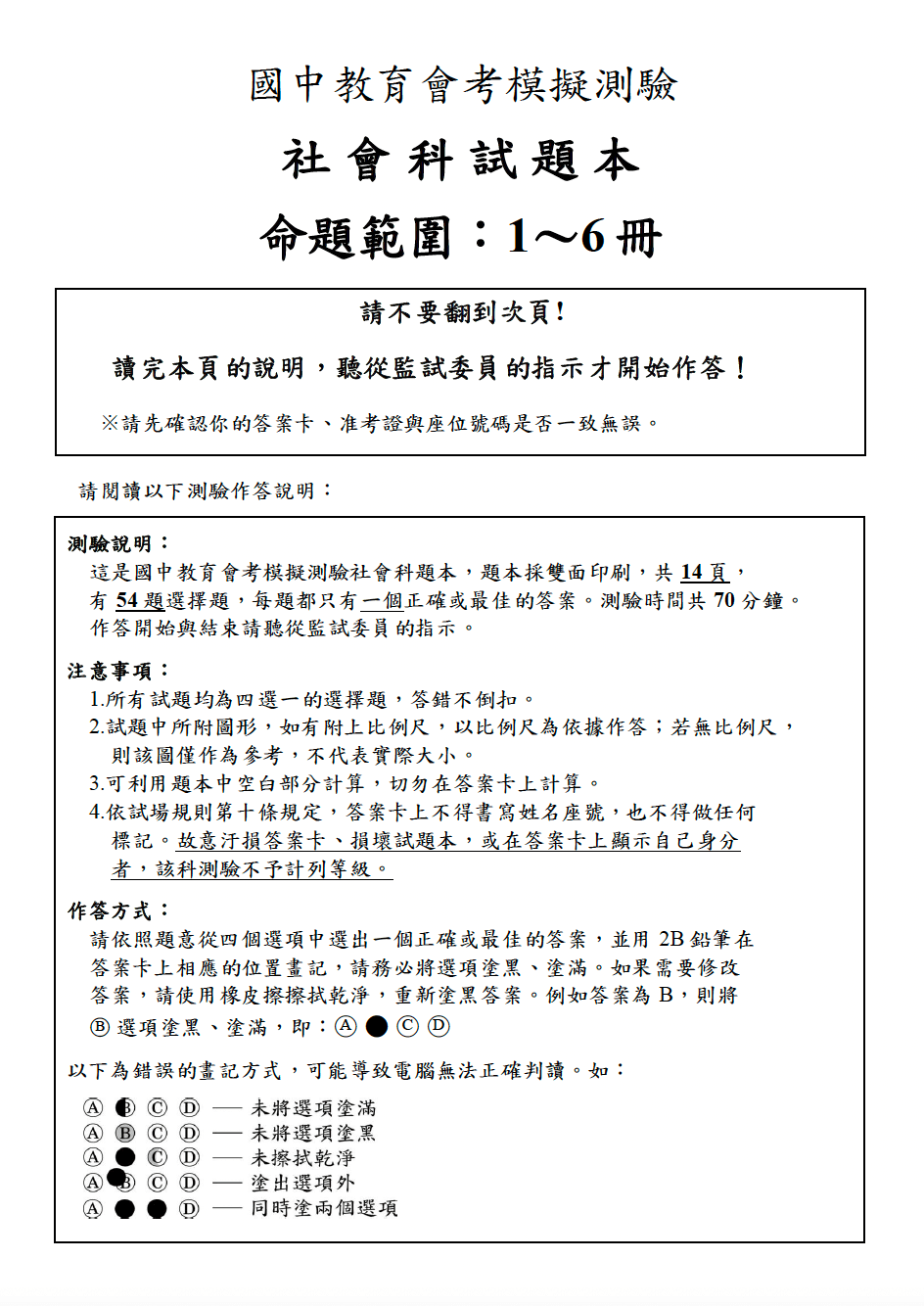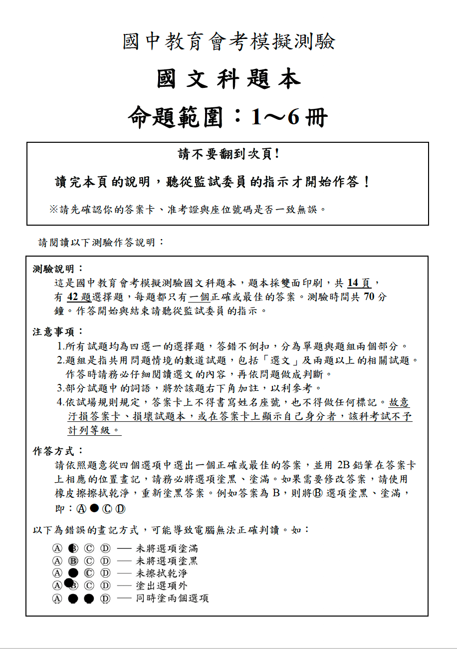 五科目全選擇試題,試題編排、題量、難易度參照會考規格。